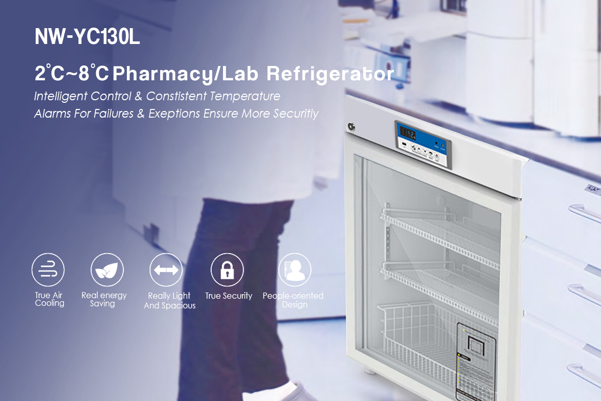 NW-YC130L is a biomedical and medical refrigerator that offers a professional and stunning appearance and has a storage capacity of 130L for storing medicines and vaccines, it’s a small medical refrigerator that is suitable for undercounter placement, works with an intelligent temperature controller, and provides consistent temperatures in a range of 2℃ and 8℃. The transparent front door is made of double-layer tempered glass, which is durable enough to prevent a collision, not only that, it also has an electric heating device to help eliminate condensation, and keep the stored items displayed with clear visibility. This pharmacy fridge comes with an alarm system for failure and exception occurrences, greatly protect your stored materials from spoilage. The air-cooling design of this fridge ensures no worry about frosting. With these beneficiary features, it’s a perfect refrigeration solution for hospitals, pharmaceuticals, laboratories, and researching sections to store their medicines, vaccines, specimens, and some special materials with temperature-sensitive.