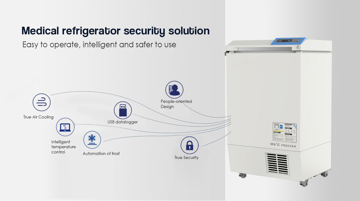 The storage temperature of this ultra low temperature chest freezer is adjustable by a high-precision and user-friendly digital microprocessor, it’s a type of automatic temperature control module, the temp. the range is between -40℃~-86℃. A piece of digital screen that works with built-in and high-sensitive temperature sensors.