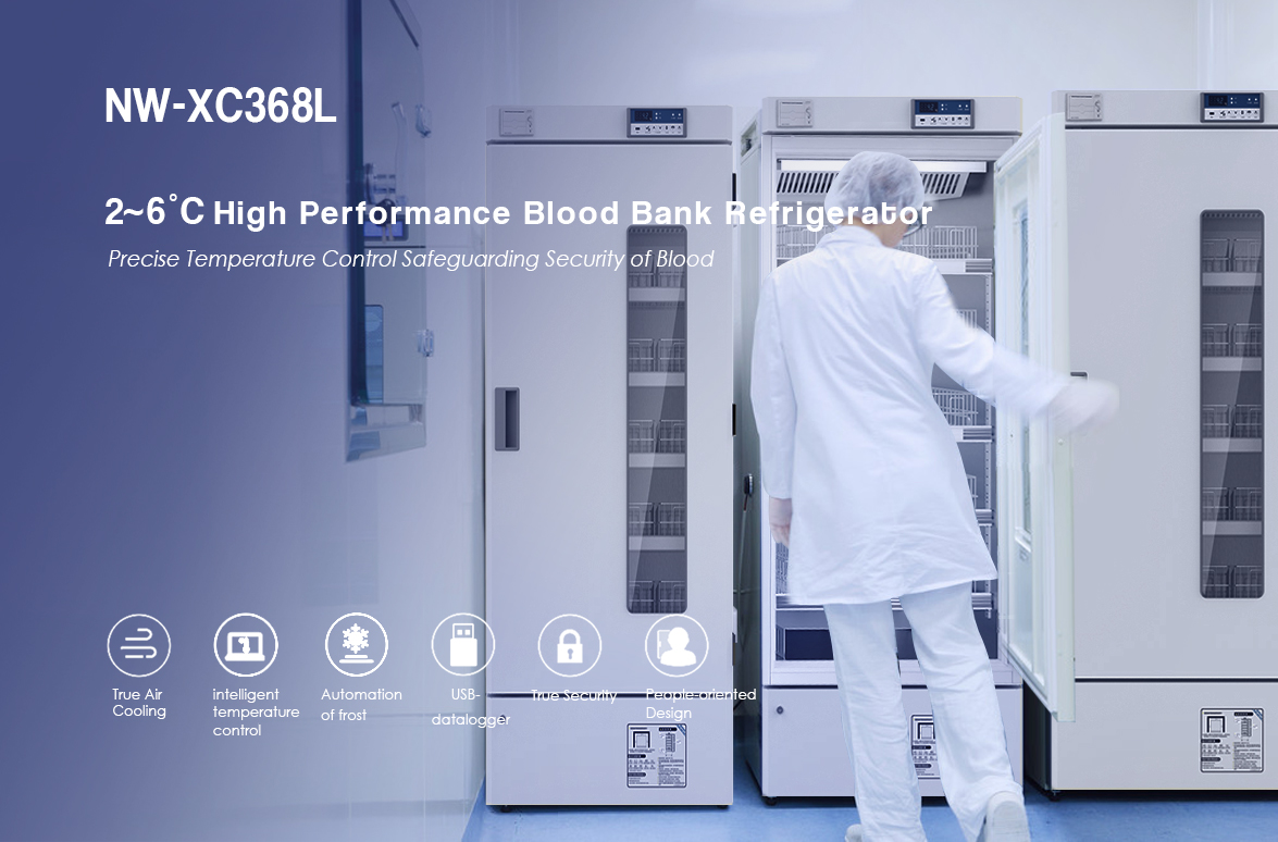Nenwell is a professional blood bank refrigerator supplier, 4℃ Blood Bank Refrigerator XC-268L is a reliable blood storage refrigerator for safeguarding security of whole blood, blood plasmas, blood compartments and blood samples. The intelligent constant temperature control ensures the temperature control precision within 2~6℃ inside the cabinet, which can perfectly promise the temperature uniformity. The blood storage refrigerator equipped with auto-defrost glass door ensures safe medical or lab material storage. What makes this blood refrigerator outstanding is that it meets or exceeds the AABB and CDC regulations for blood storage. To give you high-efficiency capacity storage, this blood bank refrigerator is designed with 5 dip-coating shelves and 15 stainless steel baskets with 150 bags 450ml loading capacity.