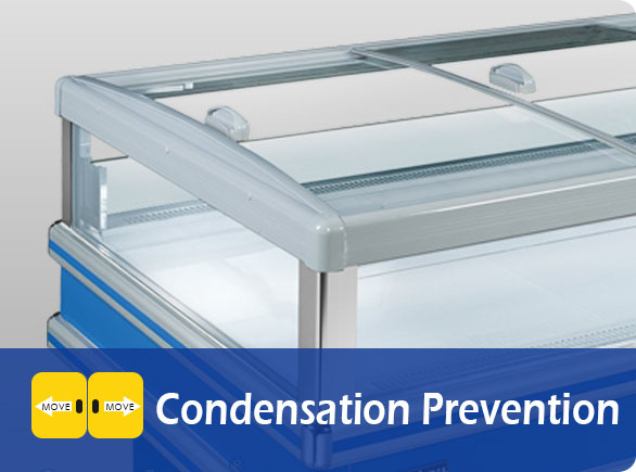 This island display freezer holds a heating device for removing condensation from the glass lid while there is rather high humidity in the ambient environment. There is a spring switch at the side of the door, the interior fan motor will be turned off when the door is opened and turned on when the door is closed.