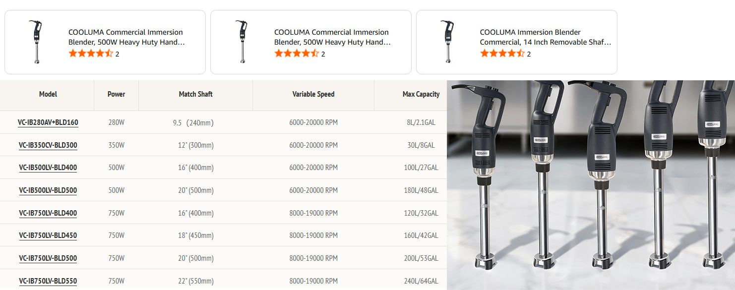 Take the VC – IB500LV – BLD400 as an example. With a 16-inch (400mm) mixing shaft, its maximum capacity can reach 100L (about 27 gallons), which is sufficient to meet the needs of small bakeries for “batch production of dough and buttercream.” The VC – IB500LV – BLD500, on the other hand, is equipped with a 20-inch (500mm) mixing shaft, expanding the capacity to 180L (about 48 gallons), making it more suitable for restaurant kitchens to handle tasks such as “centralized processing of soup bases and sauce preparation.” This design of “consistent power with flexible adjustment of the matching shaft and capacity” enables the 500W series to meet the small-batch needs of home “weekend baking parties” and also support the efficient operation of commercial scenarios.
