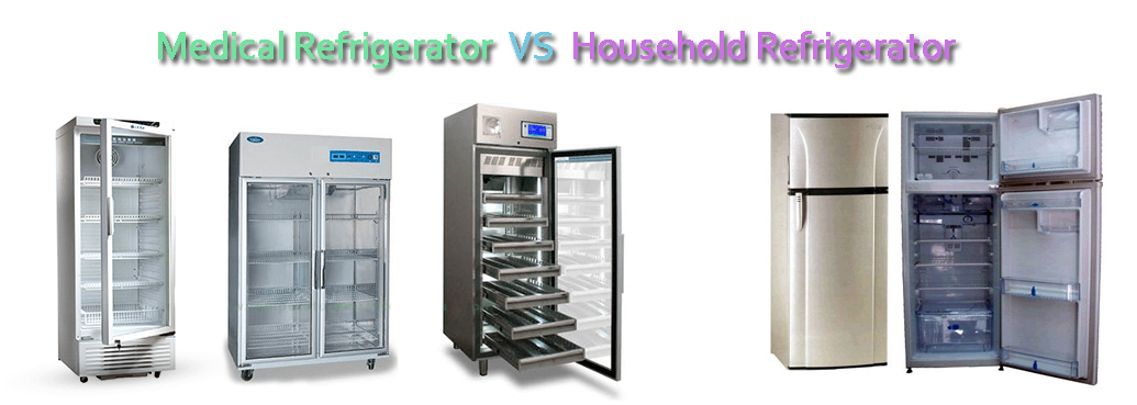 Household refrigerators use either direct cooling system or air-cooling system. But medical refrigerators all use air cooling, and some of them use reinforced air cooling. Direct cooling can create uneven temperatures throughout the cavity. So, direct cooling is not a option for medical refrigerator. In air cooling system, active fans help reduce the temperature quickly after the door is opened. Medical refrigerators also tend to have wire shelving that increases airflow, while household refrigerators have glass or plastic shelving that is easier to clean but blocks air. The ducting on medical refrigerators is also optimized for temperature uniformity, being designed to keep the temperature as close as possible to the point it's set to. Household refrigerators also tend to have crisper bins that, while useful for food storage, also block airflow and create temperature dark spots.