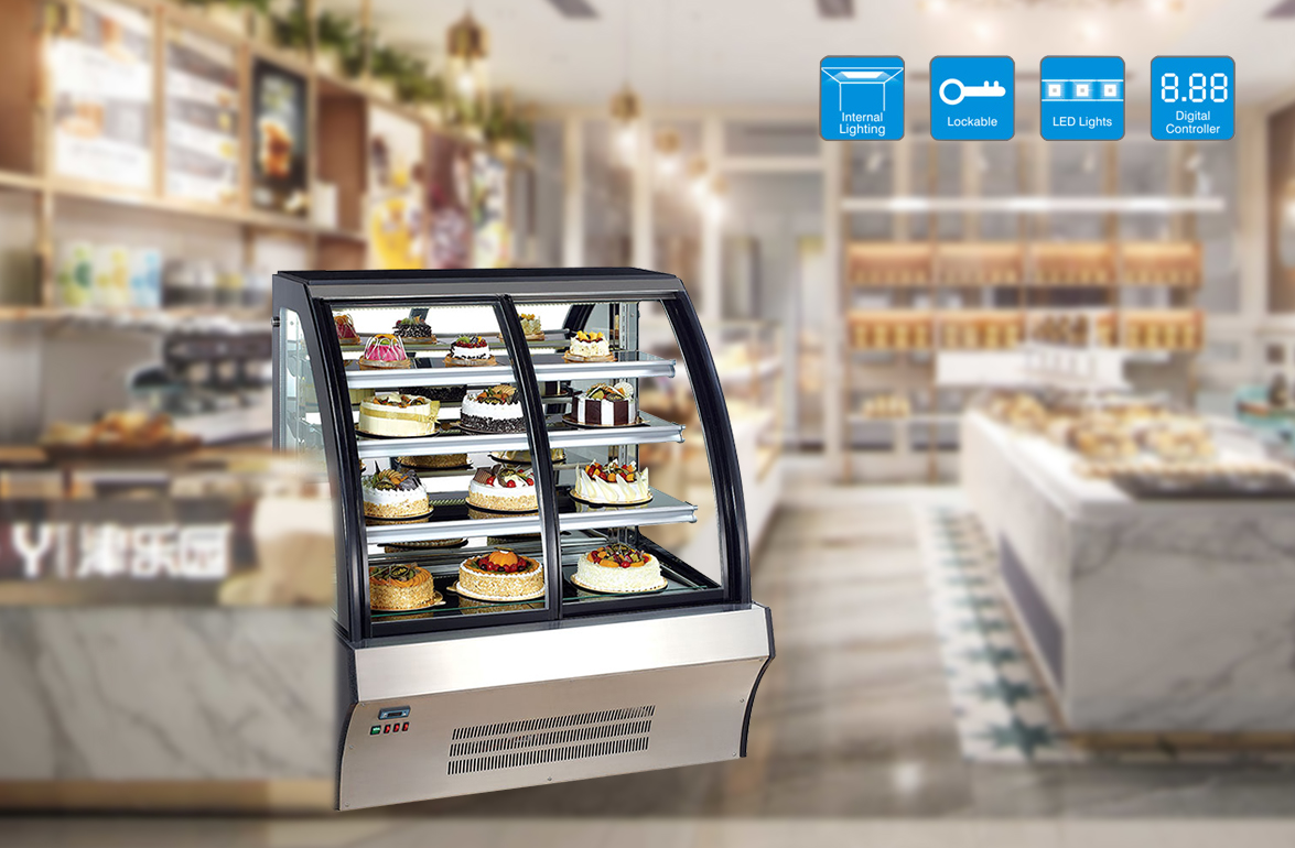 This type of Curved Glass Cake Display Case is a well-constructed unit for pastry displaying and fresh keeping, and it’s an ideal refrigeration solution for bakeries, grocery stores, restaurants, and other refrigeration applications. The wall and doors are made of clean and durable tempered glass to ensure food inside display optimally and long service life, the rear sliding doors are smooth to move and replaceable for easy maintenance. The interior LED light can highlight the food and products inside, and the glass shelves have individual lighting fixtures. This cake display fridge has a fan cooling system, it’s controlled by a digital controller, and the temperature level and working status are shown on digital display screen. Different sizes are available for your options.
