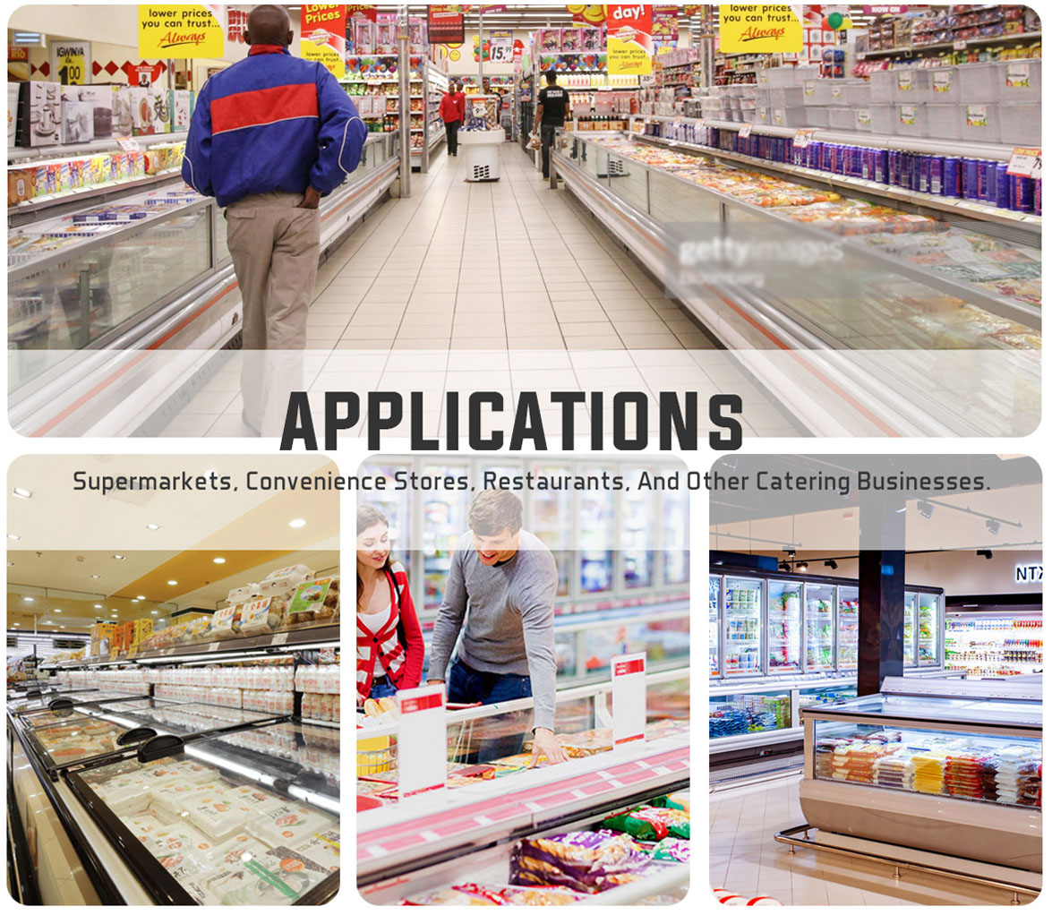 This type of Remote Deep Storage Display Island Chest Freezer Fridge comes with top sliding glass lips, it’s for supermarkets and convenience stores to keep frozen foods stored and displayed, the foods you can fill in include ice creams, packed foods, raw meats, and so on. The temperature is controlled by a fan cooling system, this island freezer works with a remote condenser and is compatible with R404a refrigerant. The perfect design includes a stainless steel exterior finished with standard blue, and other colors are also available, the clean interior is finished with embossed aluminum, and it has sliding tempered glass doors on the top to offer high durability and thermal insulation. This island display freezer is controlled by a smart system with a remote monitor, the temperature level displays on a digital screen. Different sizes are available to cater to different capacity and positioning requirements, its high freezing performance, and energy efficiency offer a great solution for commercial refrigerator applications.
