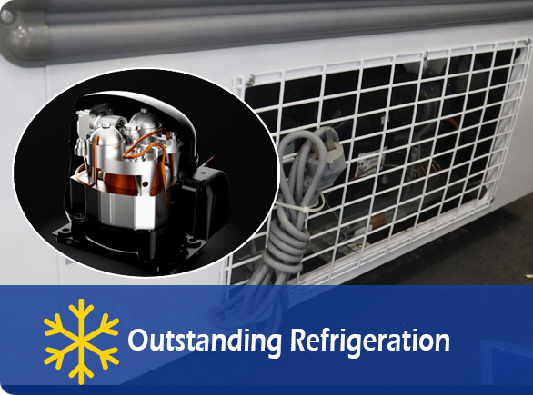 Vifuniko vya juu vya freezer hii ya aiskrimu viliundwa kwa vipande vya glasi vilivyokauka vya LOW-E ambavyo hutoa onyesho safi kabisa ili kuruhusu wateja kuvinjari kwa haraka ni bidhaa gani zinazotolewa, na wafanyakazi wanaweza kuangalia hisa mara moja bila kufungua mlango ili kuzuia hewa baridi isitoke kwenye kabati.