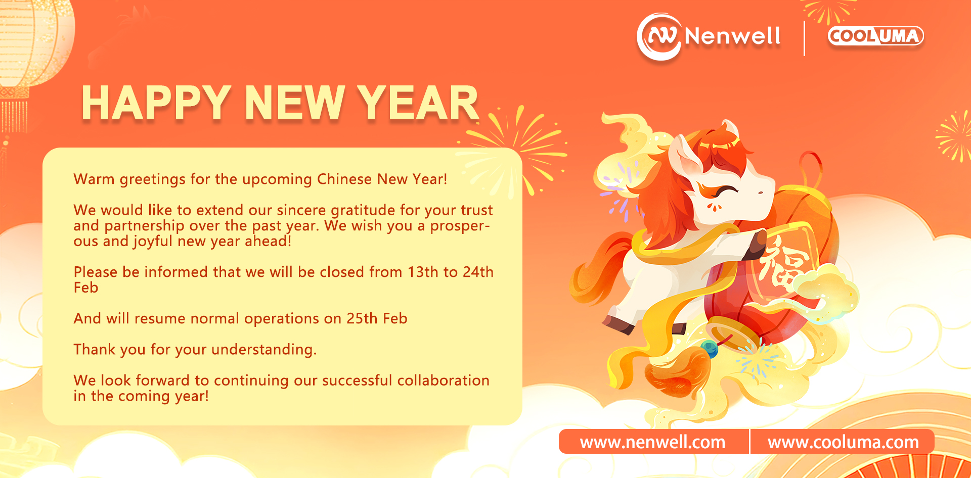 We would like to extend our sincere gratitude for your trusst and partnership over the past year. We wish you a prosper-ous and joyful new year ahead!