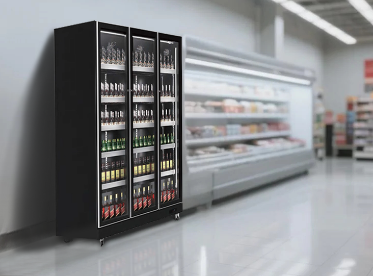 This glass refrigerator holds a heating device for removing condensation from the glass door while there is rather high humidity in the ambient environment. There is a spring switch at the side of the door, the interior fan motor will be turned off when the door is opened and turned on when the door is closed.